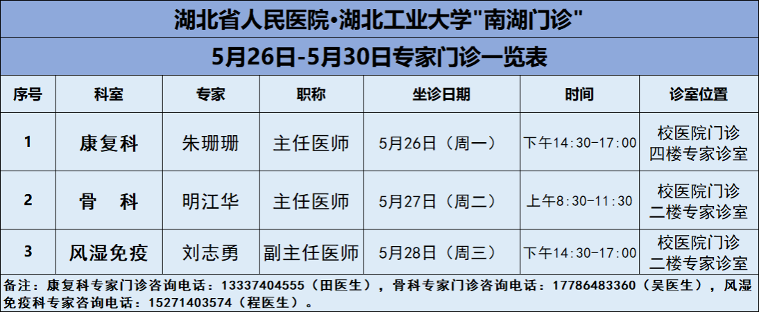 5月26日-5月30日,搜狐体育_nba虎扑篮球-直播|官网医院将邀请湖北省人民医院知名专家——康复科朱珊珊主任、骨科明江华主任、风湿免疫科刘志勇主任三位专家教授前来校医院坐诊(具体坐诊信息见下),请广大师生、周边居民持续关注南湖门诊专家坐诊信息,如有: