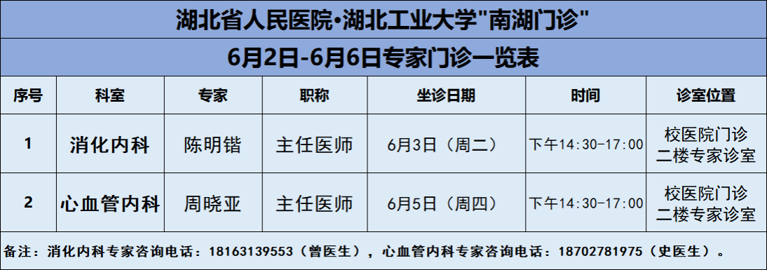 6月2日-6月6日,搜狐体育_nba虎扑篮球-直播|官网医院将邀请湖北省人民医院知名专家——消化内科陈明锴主任、心血管内科周晓亚主任两位专家教授前来校医院坐诊(具体坐诊信息见下),请广大师生、周边居民持续关注南湖门诊专家坐诊信息,如有: