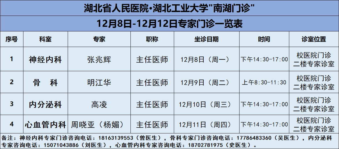 12月8日—12月12日,搜狐体育_nba虎扑篮球-直播|官网医院将邀请湖北省人民医院知名专家——神经内科张兆辉主任、骨科明江华主任、内分泌科高凌主任、心内科周晓亚主任三位专家教授前来校医院坐诊(具体坐诊信息见下)。请广大师生、周边居民持续关注南湖门诊专家坐诊信息,如有: